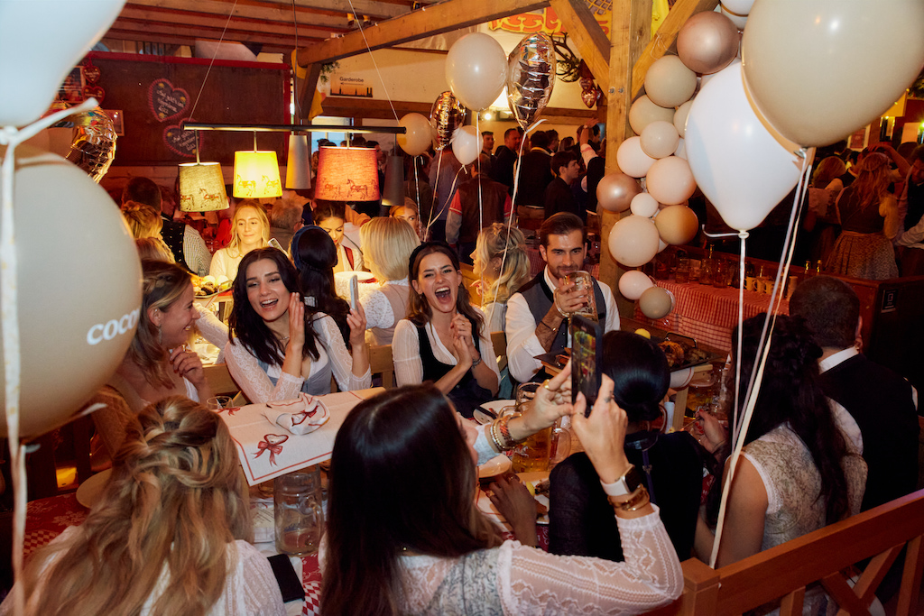 We offer up to 2300 seats with tablecloths, direct access to the Theresienwiese, and a charming welcome from our hostesses, who will escort you to your table. Original Wiesn music is already ensured!