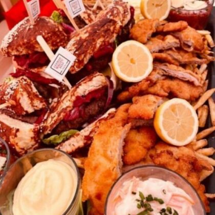 prawns in garlic oil, skin-on fries, coleslaw, HIPPO truffle cream and wild cranberries