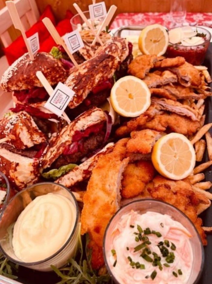 Spicy beef tartare, Bavarian Wagyu beef burger in a pretzel bun with red wine shallots, strips of Kaiser Wiener Schnitzel (veal)