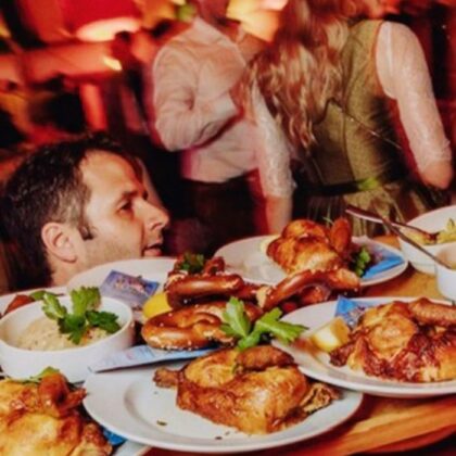 Our menu offers everything your heart desires: crispy farmhouse chicken, tender steaks from our in-house Wagyu cattle breeding, and delicious Bavarian and vegetarian specialties. Alongside, we serve freshly tapped Spaten Spring Wiesn beer, selected wines, and sparkling champagne.