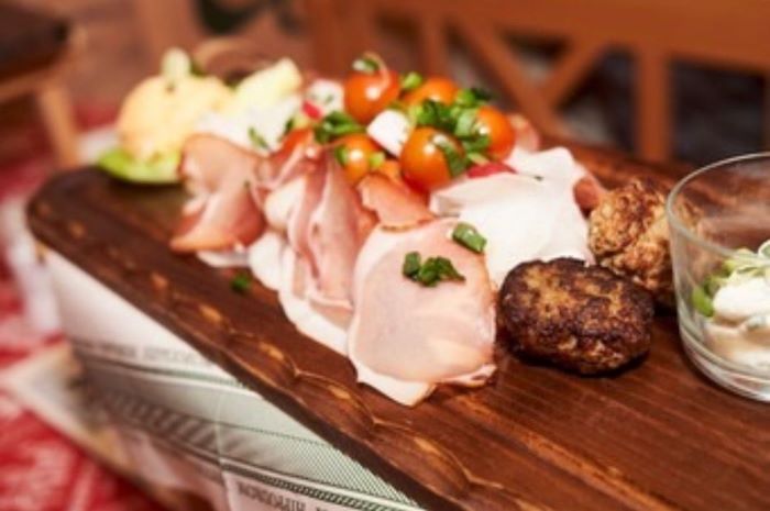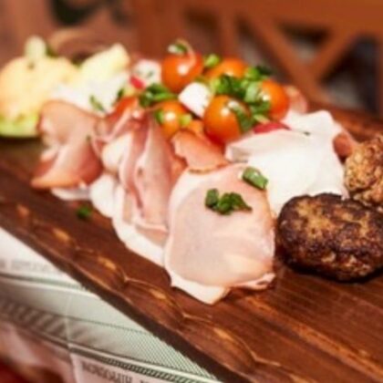 Andechs meat patties, homemade liverwurst, mountain bacon, hearty Landjäger sausage, Obatzda cheese spread, creamy horseradish cream cheese, Munich beer radishes and radishes, spring onions, garden and pickled gherkins, vine tomatoes, sweet cream butter, oven-fresh baker’s pretzel and farmer’s crusty bread